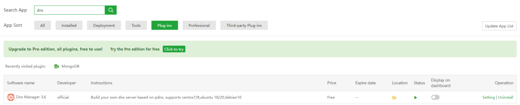 2. Masuk menu App Store > Plug-ins. Pastikan DNS manager sudah terinstall seperti contoh gambar berikut: