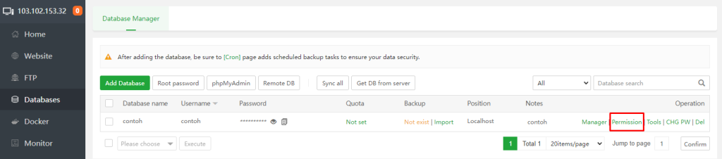 4. Setelah itu masuk ke menu database > permission untuk memberikan permission akses pada database yang akan diremote