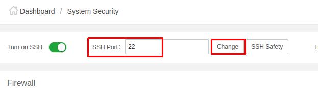 3. Jika sudah masuk pada halaman Security silakan ubah SSH Portnya pada bagian SSH Port dari port 22 ke port yang kita inginkan, kemudian Change untuk menyimpan perubahan portnya.