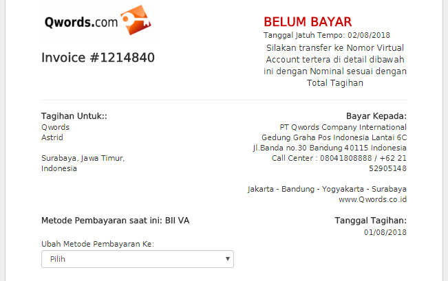 - Setelah scroll ke bawah pada halaman invoice, Anda akan menemukan No. Virtual Account. Nomor ini-lah yang digunakan untuk melakukan transfer. Perlu Anda ketahui, bahwa No. Virtual Account berbeda-beda untuk setiap customer. No. Virtual Account Anda akan tetap sama pada transaksi Anda berikutnya di Qwords selama masih menggunakan akun dan bank yang sama. Untuk pembayaran Virtual Account BII, Anda tidak dapat melakukan pembayaran via Teller atau Transfer Antar Bank.