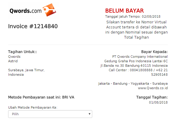 Mengapa memilih metode virtual account? Karena metode ini tidak membutuhkan konfirmasi bayar secara manual. Konfirmasi pembayaran layanan di Qwords sepenuhnya dicek otomatis oleh sistem. Pada metode Virtual Account Bank BRI, Anda dapat melakukan pembayaran melalui ATM, m-Banking, dan Internet Banking.