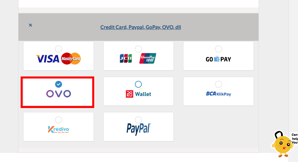 2. Klik pilihan Credit Card, PayPal, GoPay, OVO, dll lalu klik metode OVO.