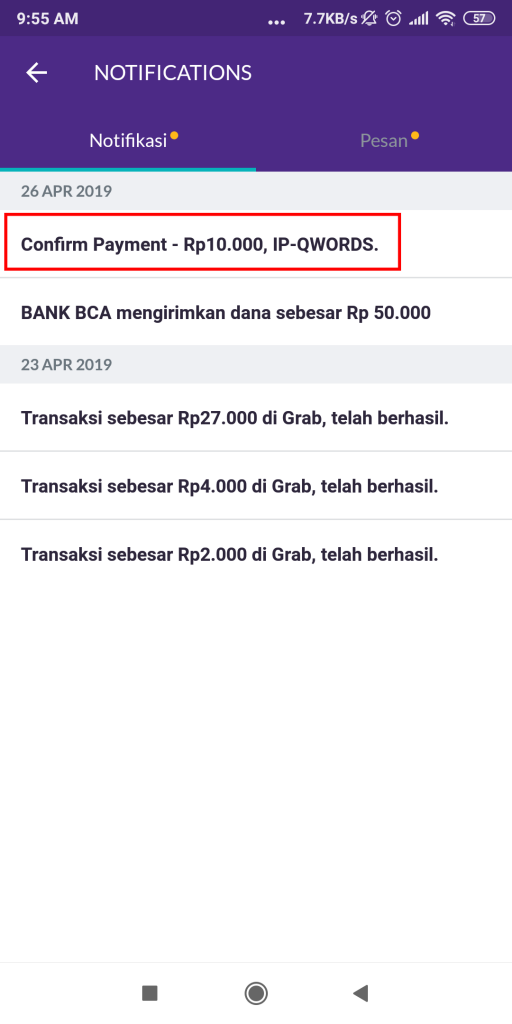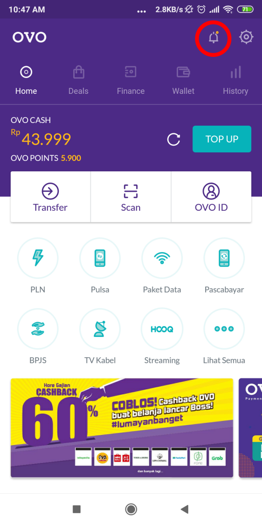 5. Buka notifikasi OVO pada smartphone dengan klik pada gambar lonceng. Pastikan saldo Anda di aplikasi cukup untuk melakukan transaksi.