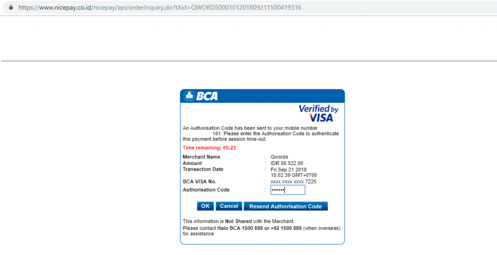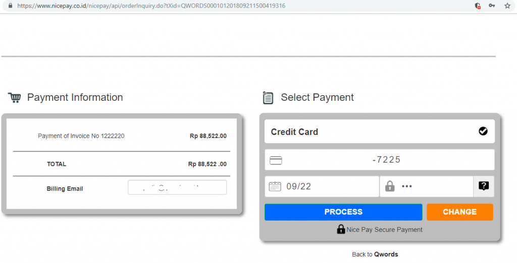 2. Selanjutnya, Ada akan diarahkan pada halaman nicepay. Masukkan nomor kartu kredit, masa berlaku kartu kredit, dan nomor CVV > Klik Process.