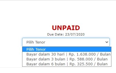 Anda akan dialihkan pada halaman invoice. Cek kembali daftar pesanan Anda, jika telah sesuai, Pilih Tenor yang diinginkan lalu klik tombol Submit pada ujung kanan atas.