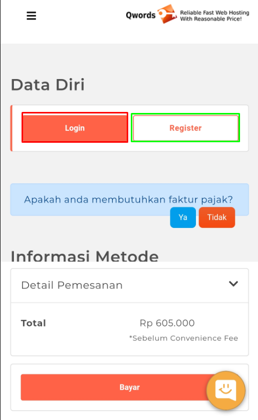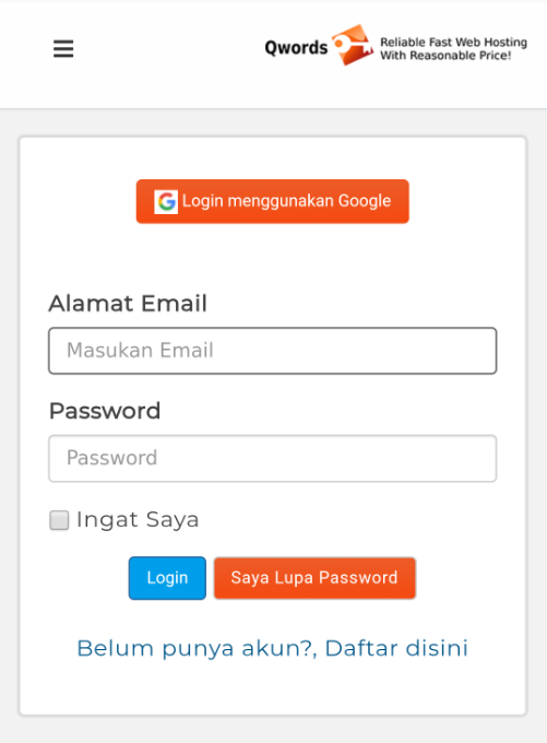 3. Selanjutnya kita harus Login terlebih dahulu ( jika sudah memiliki akun Qwords ) atau memilih Register jika belum memiliki akun Portal Qwords.