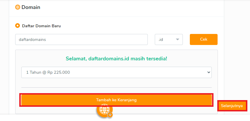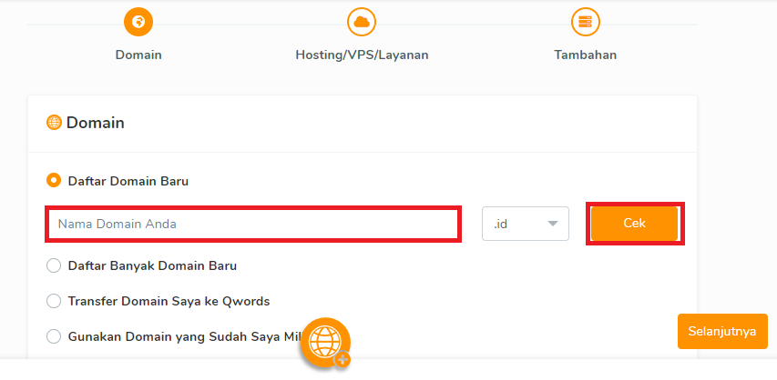 4. Masukkan nama domain yang diinginkan pada kolom yang tersedia. Lalu, klik Cek.