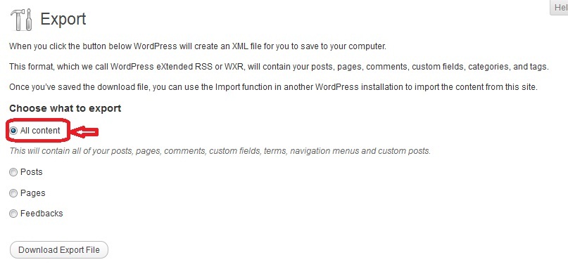 1. Lakukan export semua posting (dan komentarnya), Pages, Archives dan Categories yang sudah ada sebelumnya di blog kita yang di WordPress.com melalui halaman dashboard blog di wordpress.com -> Tools -> Export -> Pilih “ALL Content” -> Download Export