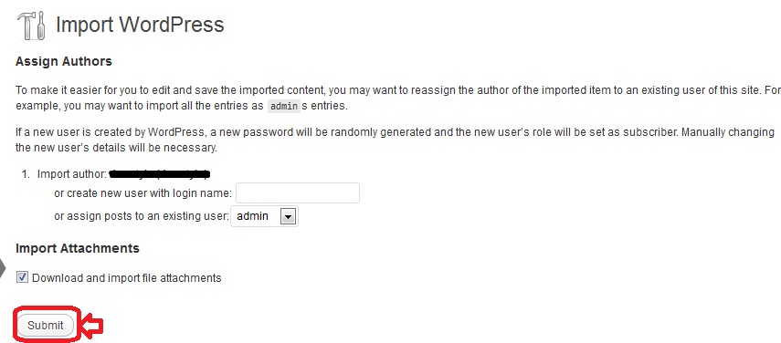 7. Jika file telah selai maka akan muncul kembali dialog untuk user post, anda dapat membuat user baru atau menggunakan existing user , centang pada bagian “Download and import file attachments” -> Klik “Submit”
