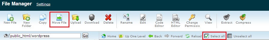 5. Pindahkan seluruh file yang ada di folder wordpress tersebut ke folder public_html alias naik 1 tingkat dengan cara klik Select All lalu Move File