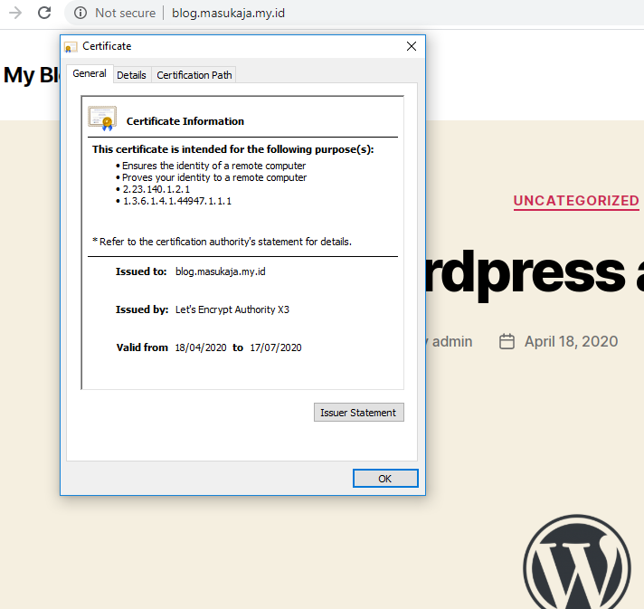 1. Pastikan SSL sudah terpasang. Untuk mengecek bisa dengan akses websitenya dengan https kemudian klik tanda seru / not secure pada address bar browser dan klik certificate