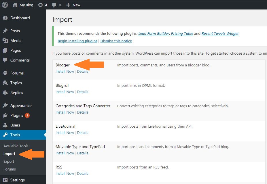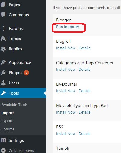 3. Saat sudah berada di dashboard, pilih menu tools –> import kemudian klik Blogger. Klik tombol Install now.