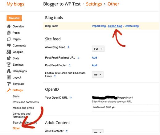 2. Langkah selanjutnya yaitu melakukan Export XML pada blogspot anda dengan Login ke dashboard blogspot dan pilih settings –> other, dan di bawah Blog Tools klik Export Blog.