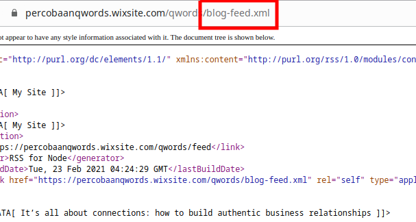 - Selanjutnya jika sudah memiliki wordpress, pertama kita generate RSS terlebih dahulu di halaman web WIX dengan menambahkan “/blog-feed.xml” pada url websitenya
