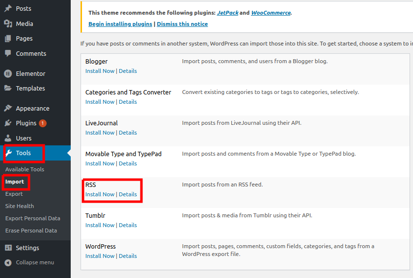 - Setelah berhasil disimpan, kita login ke dashboard WordPress dan pilih menu Tools >> Import >> RSS
