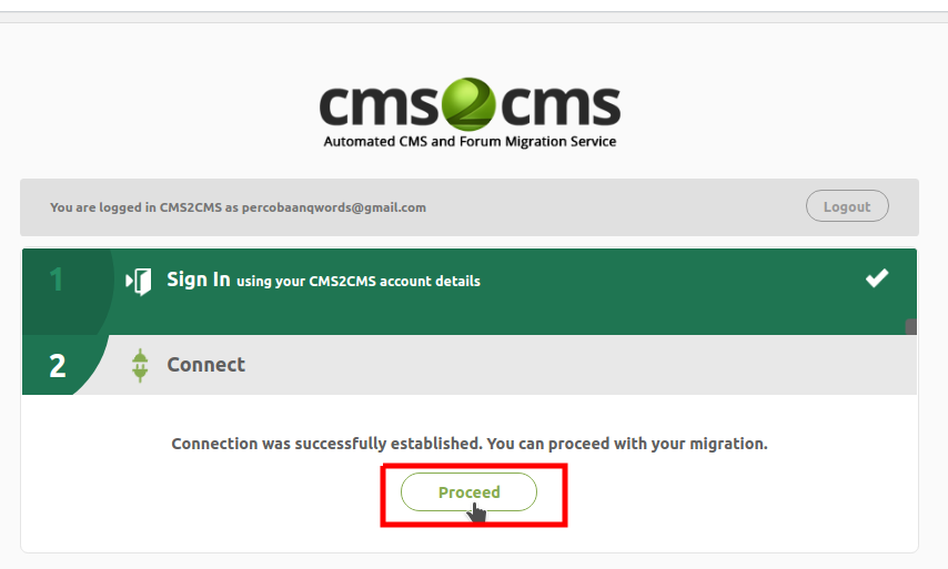 - Setelah berhasil login, klik button Connect untuk mengkoneksikan kedua CMS