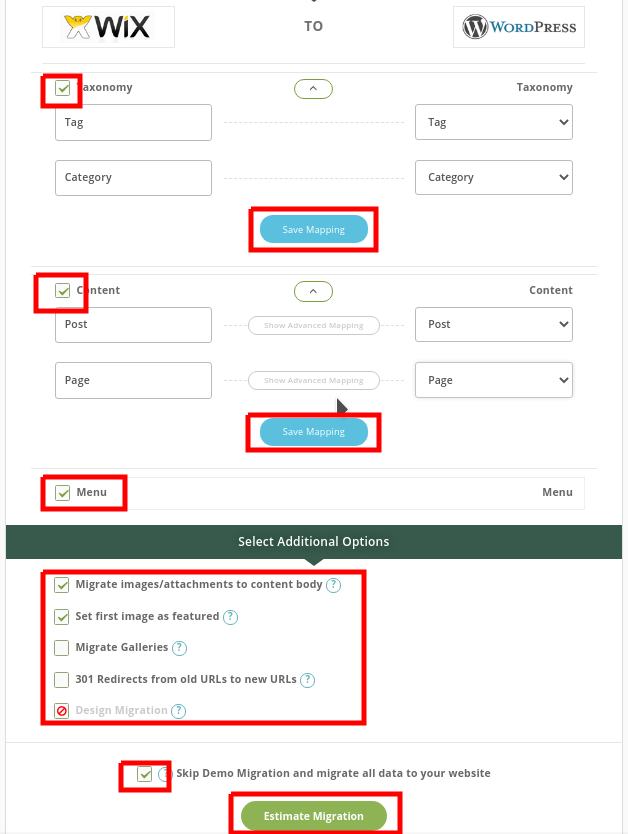 - Setelah berhasil terkoneksi dengan baik, maka akan muncul Mapping Lokasi dan Konten apa saja yang akan di migrasikan dari WIX ke WordPress