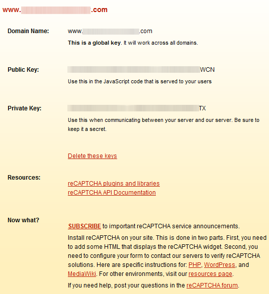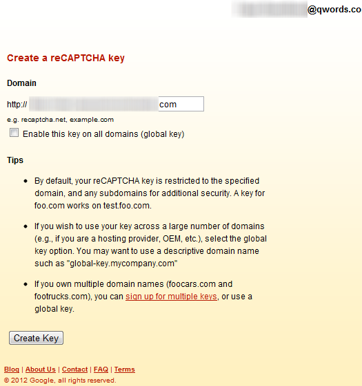 Sekarang masukan nama domain anda (mis: www.nama.domains) selanjutnya klik tombol “Create Key” untuk membuat key yang diperlukan untuk melakukan pemasangan CAPTCHA pada website Joomla.