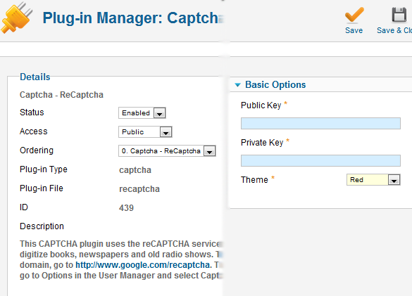 Masukkan Public Key dan Private Key yang diperoleh dari google.com/recaptcha, lalu simpan dengan cara klik save atau save & close. Sampai disini semua setting telah selesai. Sekarang silakan cek halaman registrasi user website Joomla anda.