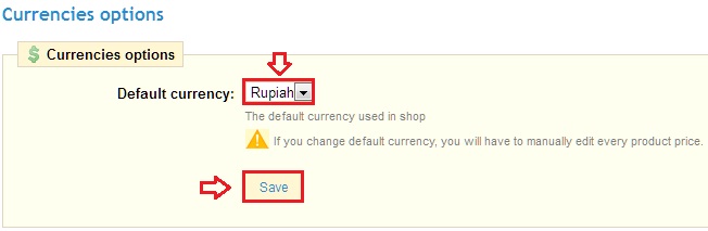 Lakukan lah konfigurasi ini sebelum anda menginput produk-produk anda. jika konfigurasi ini dilakukan setelahnya maka anda harus mengubah mata uang produk-produk anda satu persatu.