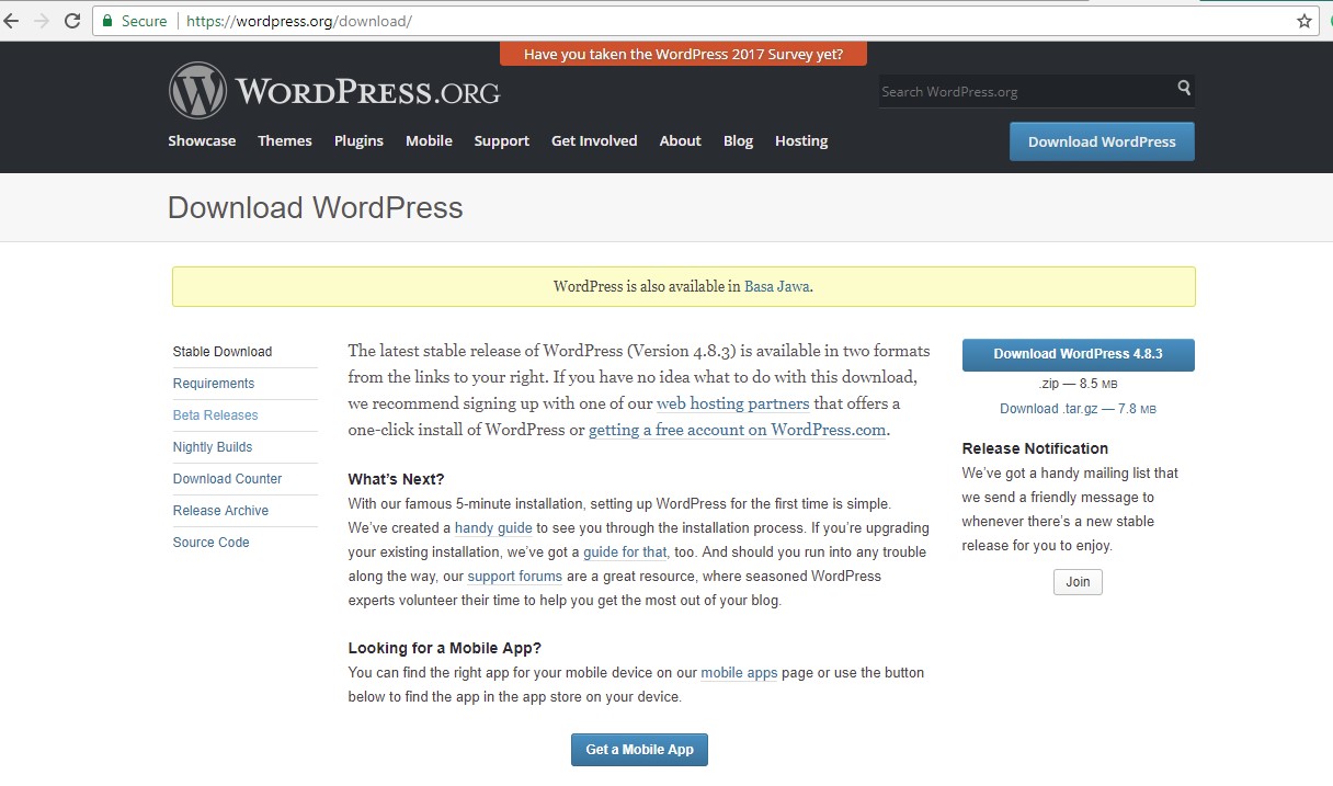 1. download file instalasi wordpress versi terbaru pada halaman : https://wordpress.org/download/
