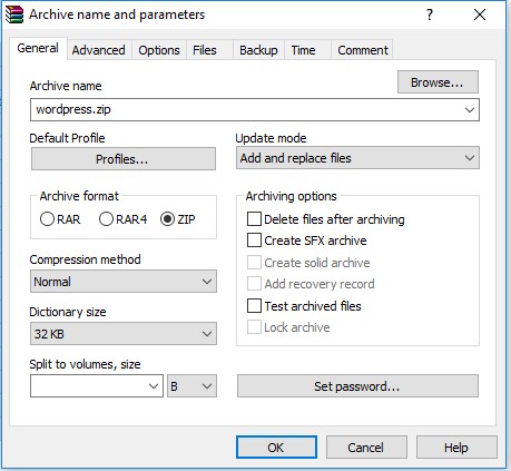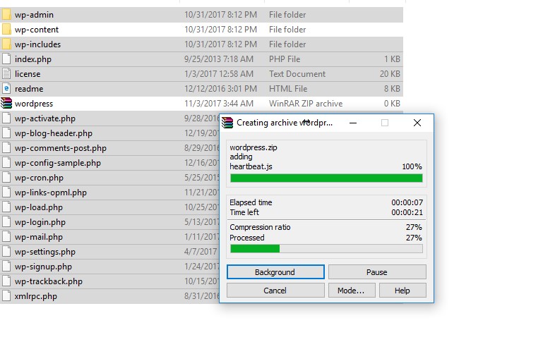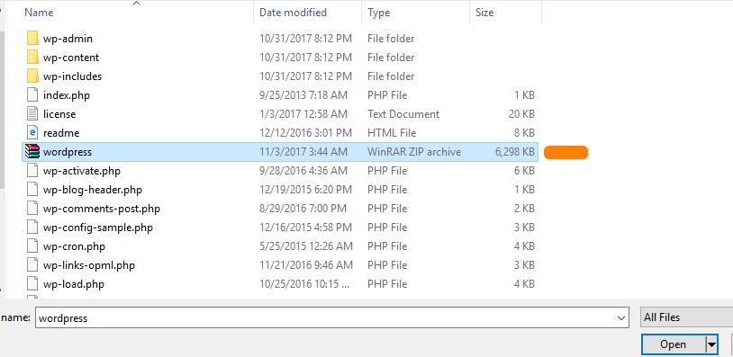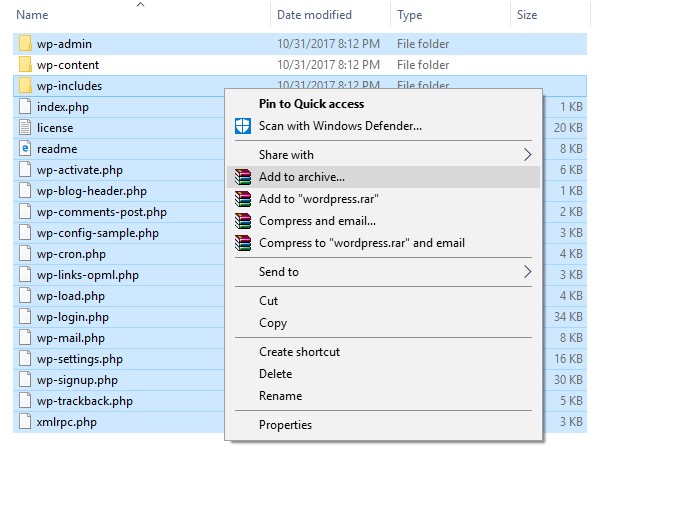 3. terdapat beberapa file yang sudah di extract, lalu pilih semua file (tanpa folder wp-content) > klik kanan > pilih add to archive > simpan semua file tersebut kembali menjadi file ekstensi .zip
