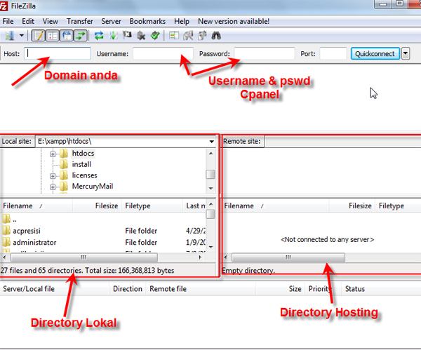 arahkan pada directory hosting pada bagian /public_html, Kemudian drag dari kanan (Directory Lokal) ke kiri (Directory Hosting)