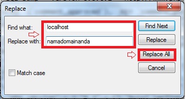 Perbedaan export database joomla dengan wordpress ada di bagian ini, pada wordpress anda harus mengedit isi dari file database anda seperti gambar diatas. anda bisa menggunakan text editor seperti notepad untuk mengeditnya.