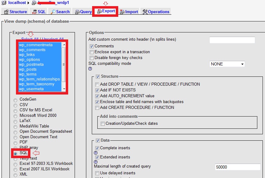 Perhatikan data yang diexport terpilih semua “select all” dan jenis file database “SQL”