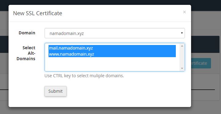- Dengan memilih menu tersebut kita akan melakukan Generate NEW sertificate SSL Let’s Encrypt Request ke sisi server, tahapan selanjutnya akan muncul pop up domain yang akan kita pasang SSL Let’s Encrypt, dalam kasus ini kami mencoba memasang SSL Let’s Encrypt di www.nama.domains dan mail.nama.domains, tahap selanjutnya klik “SUBMIT”