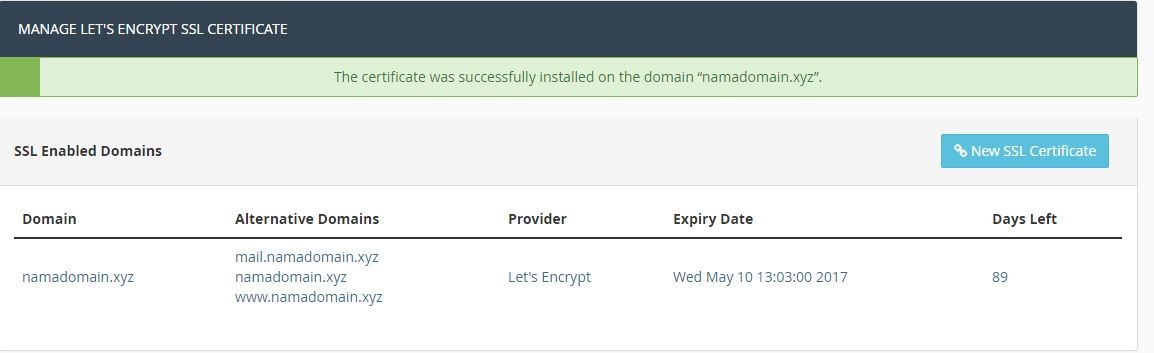 adapun setelah 90 hari maka akan otomatis di lakukan renew oleh sistem cpanel, jika menemukan kendala saat proses renew bisa di konsultasikan melalui ticket kami melalui support ticket 🙂