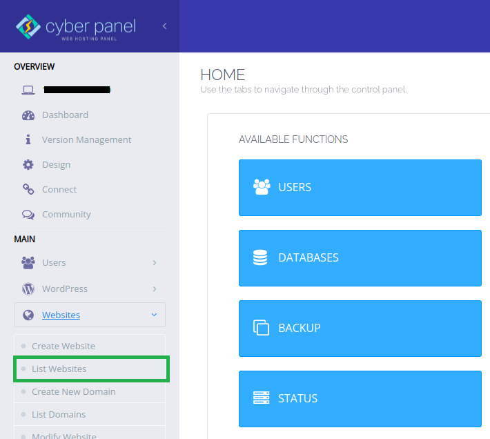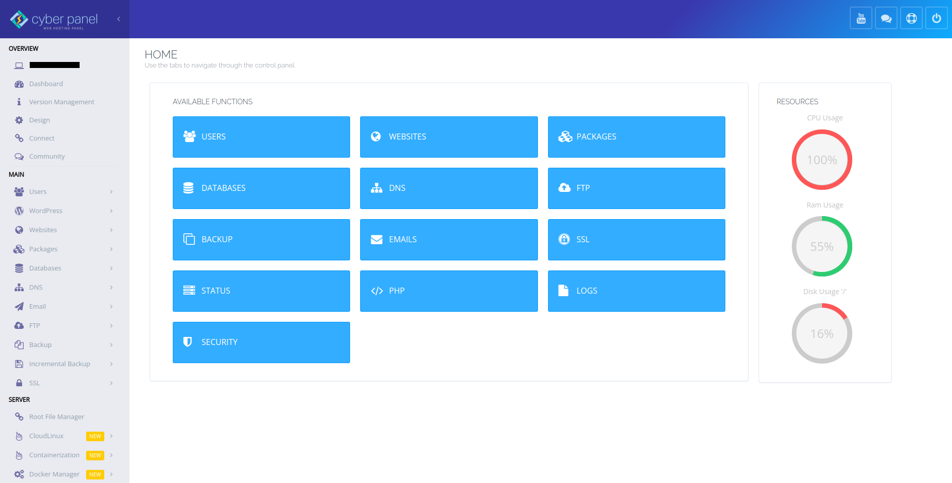 2. Selanjutnya kita akan berada di beranda / home kontrol CyberPanel.