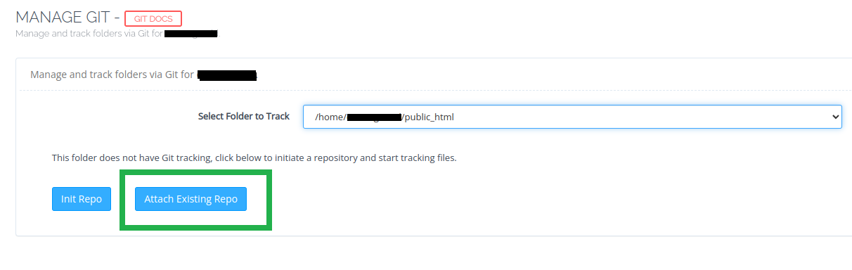6. Selanjutnya kita bisa membuka dan mulai GIT Manager pada CyberPanel. Setelah itu kita Pilih folder yang akan kita sinkonisasi dengan GIT, kemudian klik Attach Existing Repo untuk memulai repositori.