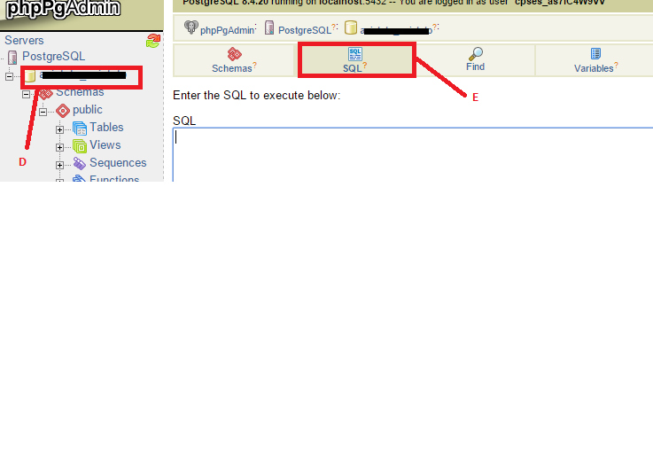 5. Pilih database yang sudah kita buat tadi di sebelah kiri. Lalu, klik menu SQL di sebelah kanan seperti pada gambar E berikut ini.