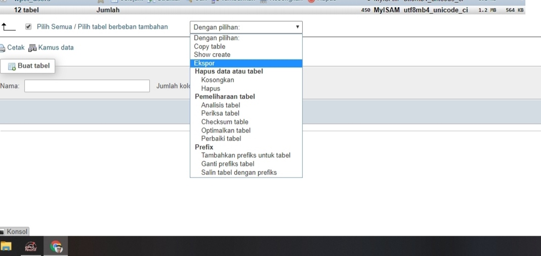 2. Selanjutnya setelah masuk ke Phpmyadmin, kita klik nama database web kita lalu pilih Check All, Setelah itu dapat memilih Export pada Dropdown Menu.