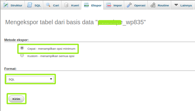 3. Pilih metode dan formatnya, lalu tekan tombol kirim. Maka file sql akan terdownload ke PC yang kita gunakan.