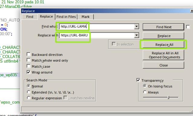 5. Tekan tombol CTRL + F untuk mencari url yang akan di ubah, pilih Menu replace lalu inputkan url lama ke url baru