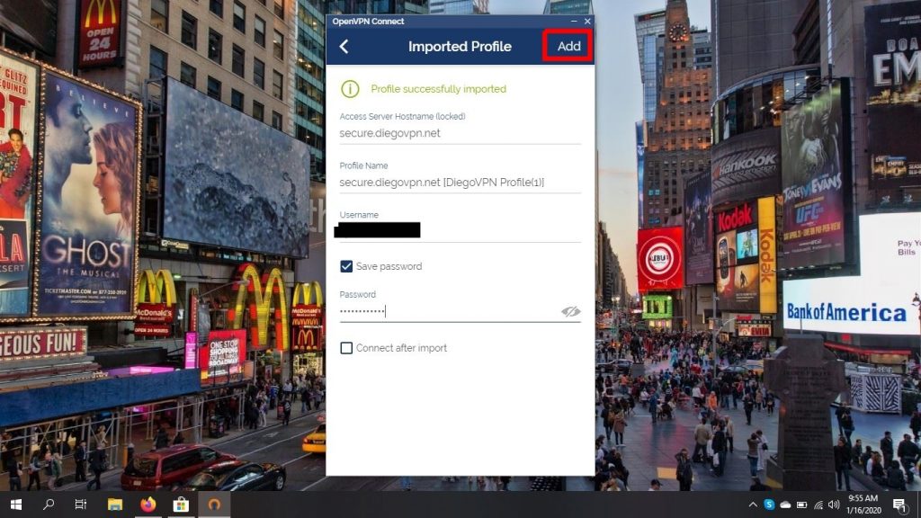6. Setelah username dan password di isi klik menu add di pojok kanan atas di aplikasi OpenVPN tersebut