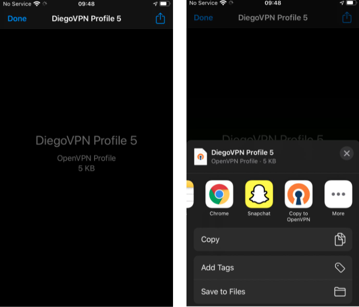 4. Setelah file profile terdownload dan tersimpan pada device IOS, silahkan bisa dibuka file profilenya dengan klik icon pojok kanan atas dan lakukan pilihan dengan aplikasi OpenVPNnya