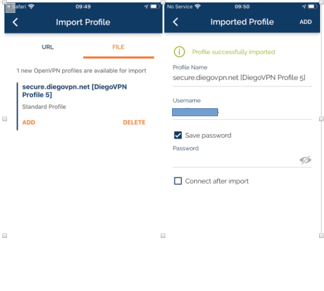 5. Setelah melakukan proses buka file dengan aplikasi OpenVPN maka secara otomatis akan masuk ke halaman import profile pada aplikasi OpenVPNnya, Selanjutnya lakukan klik ADD lalu isi user dan password sesuai dengan informasi yang ada di email.