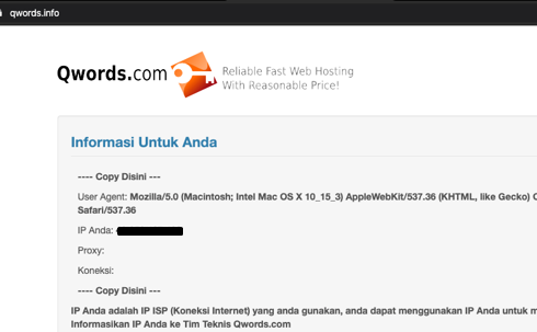 Untuk memastikan kembali bahwa koneksi yang Sahabat Qwords gunakan adalah menggunakan VPN, maka Sahabat Qwords bisa mencoba mengecek IP ISPnya dengan mengakses Qwords.info lalu cek di tampilannya dengan keterangan “IP Anda”