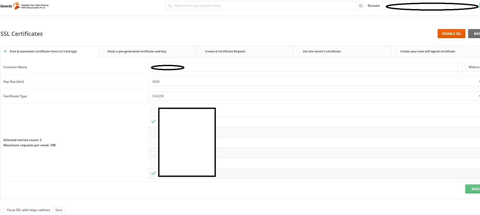 - Selected entries count = Pilih nama domain yang akan di cover Free SSL Let’s Encrypt rekomendasi bisa memilih 2 domain utama dari hostingnya