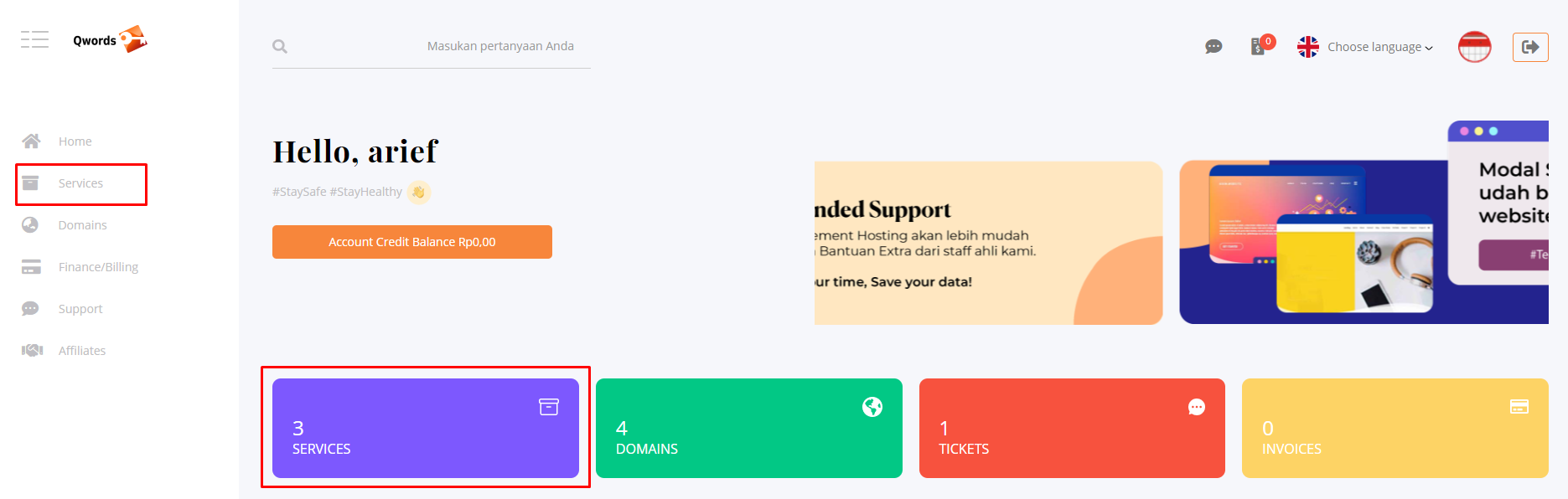 Nah, kali ini kita ingin belajar cara yang kedua nih. Yaitu cara login ke DirectAdmin melalui Portal Qwords secara otomatis.