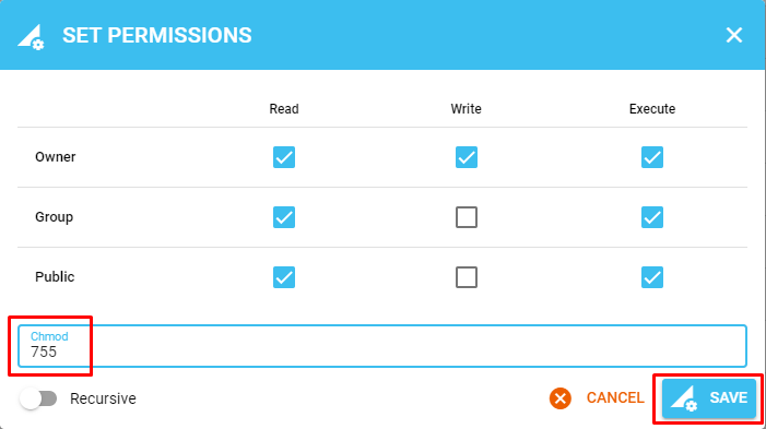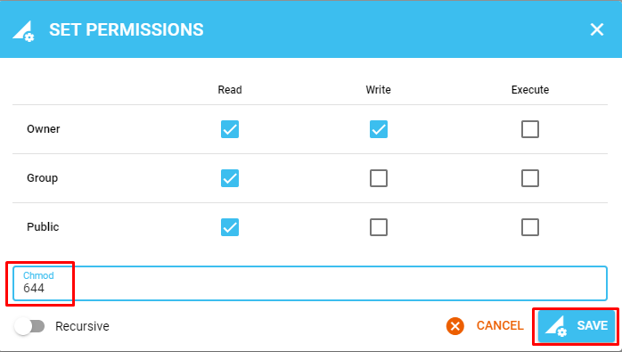 - Ubah chmod 644 untuk file dan 755 untuk folder kemudian klik SAVE