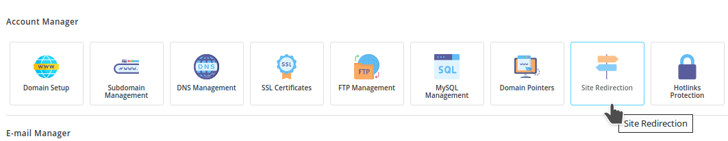 2. Pilih menu Site Redirection di bagian Account Manager.
