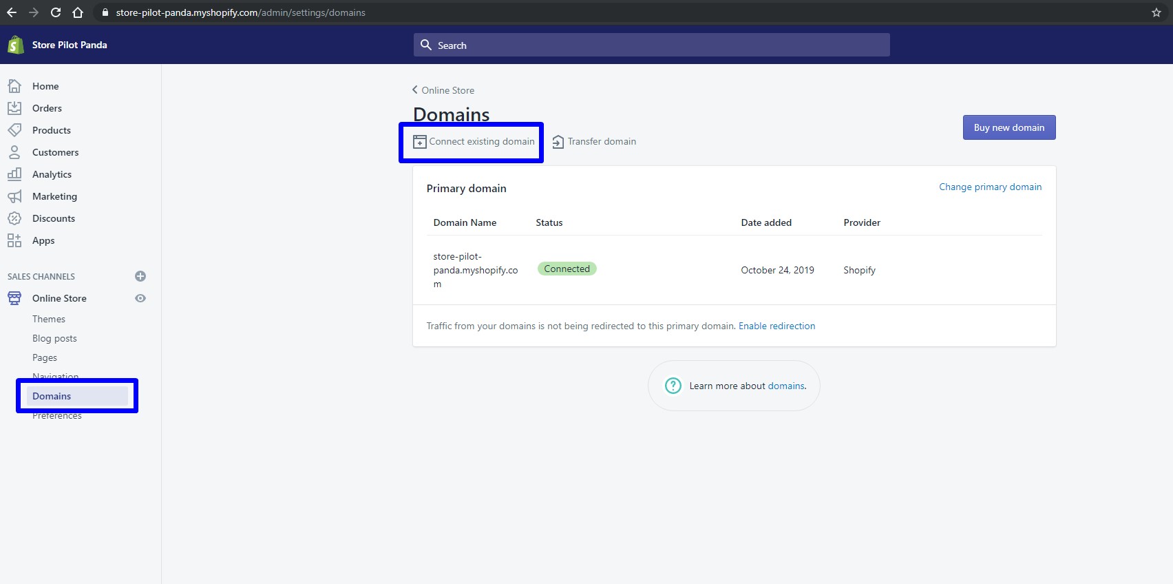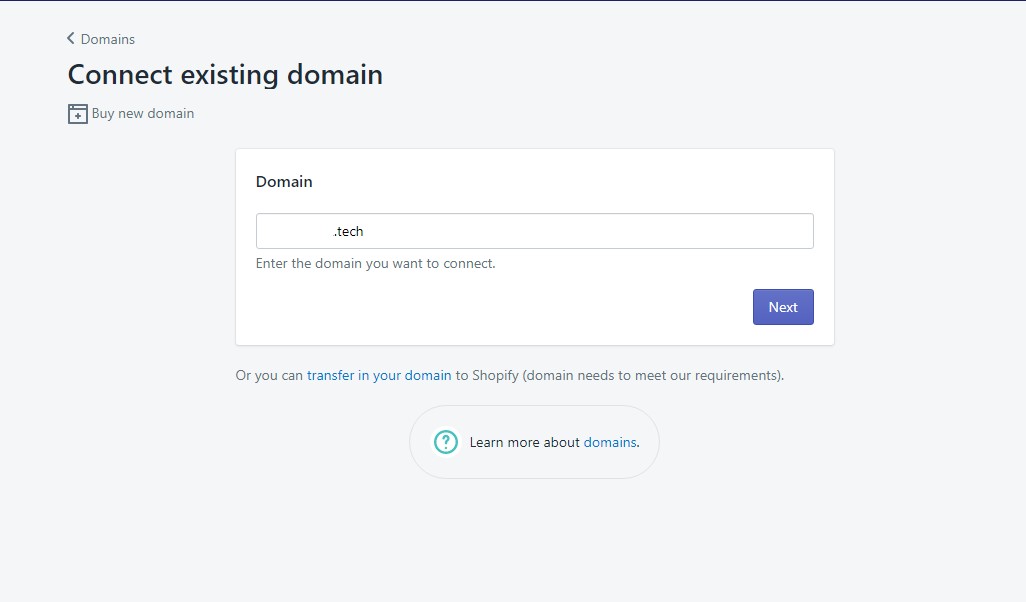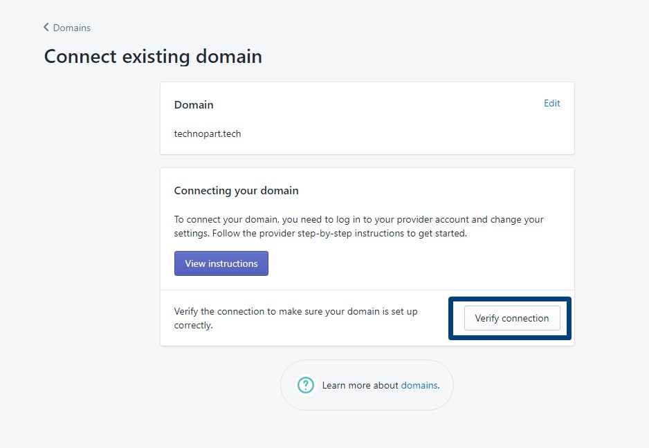 1.Masuk ke akun Shopify > Pilih Domains > Connect Existisng Domain