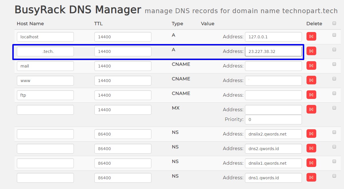 3. Selanjutnya Sahabat Qwords dapat memasukan A Record 23.227.38.32 pada DNS Manager Domain.