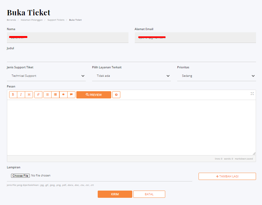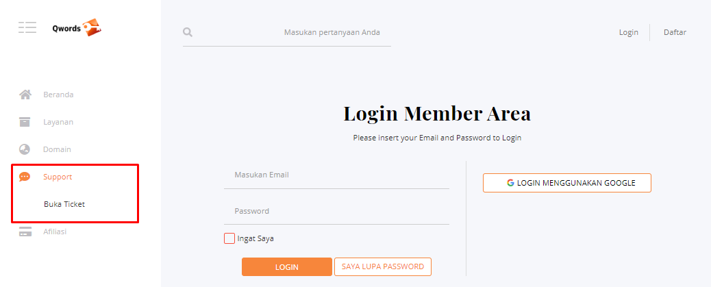 1. Buka halaman Portal Qwords di sini. Lalu, klik menu Support > Buka Ticket di sebelah kanan.