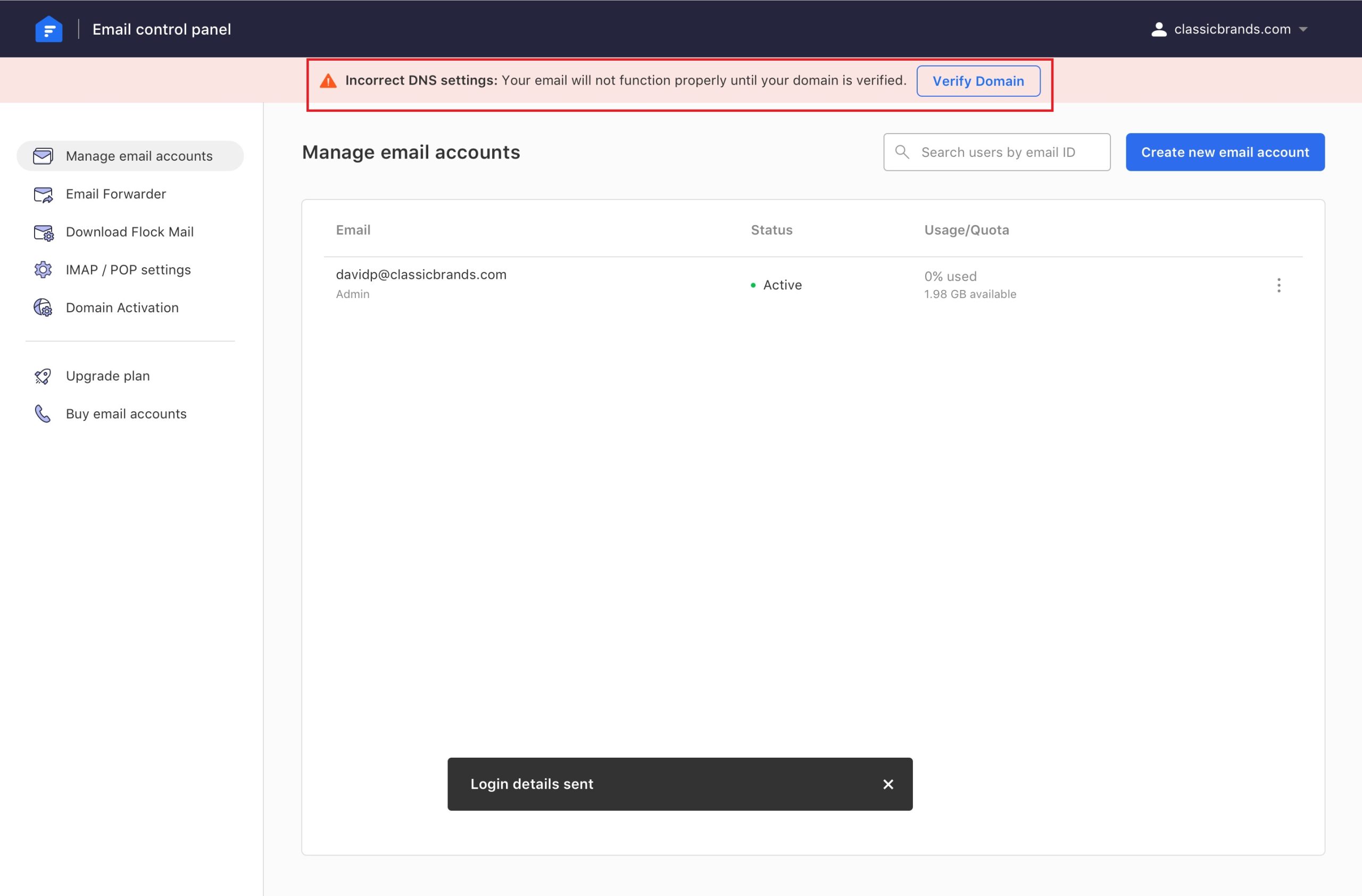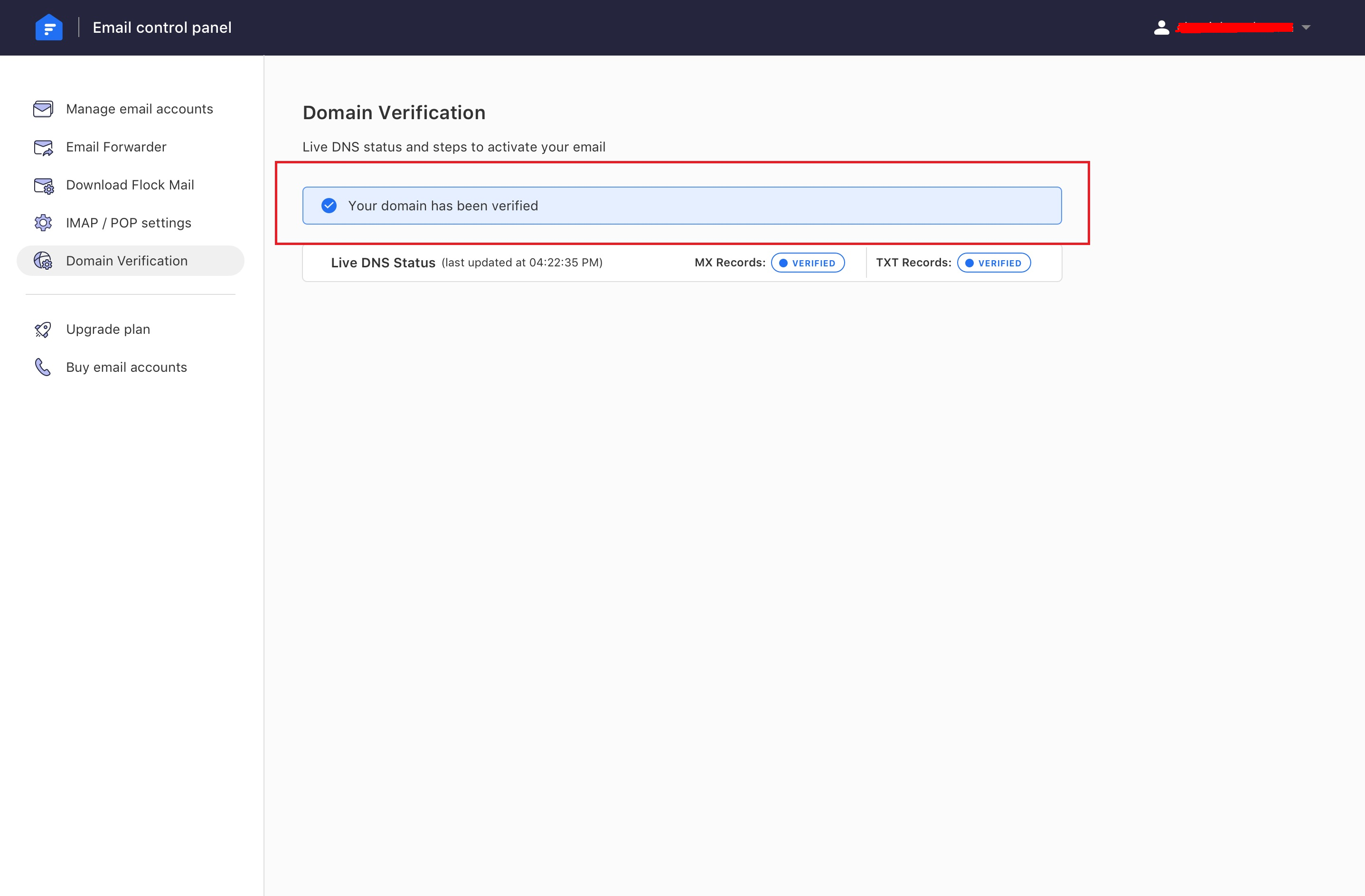 Setelah data DNS dikonfigurasi, Sahabat siap untuk mengirim dan menerima email dari domain Sahabat menggunakan Titan Mail dan Sahabat akan melihat pesan konfirmasi verifikasi di panel kontrol email Sahabat seperti yang ditunjukkan di bawah ini: