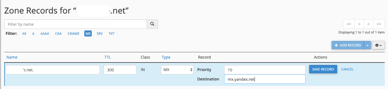 4. Klik Add Record di bagian kanan atas. Lalu, masukkan MX record dari Yandex seperti gambar di bawah.